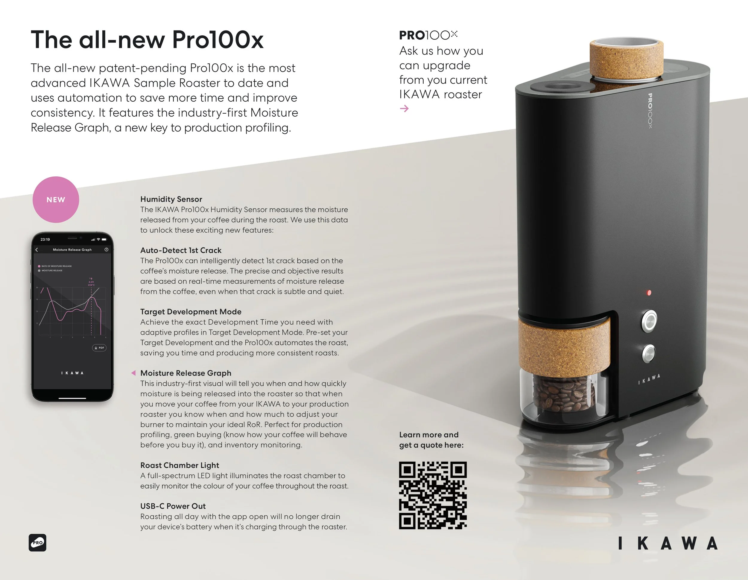 New features include: the IKAWA Humidity Sensor, Moisture Release Graph, Auto-Detect 1st Crack, Target Development Mode, Roast Chamber Light, USB-C Power Out, and improved doser.