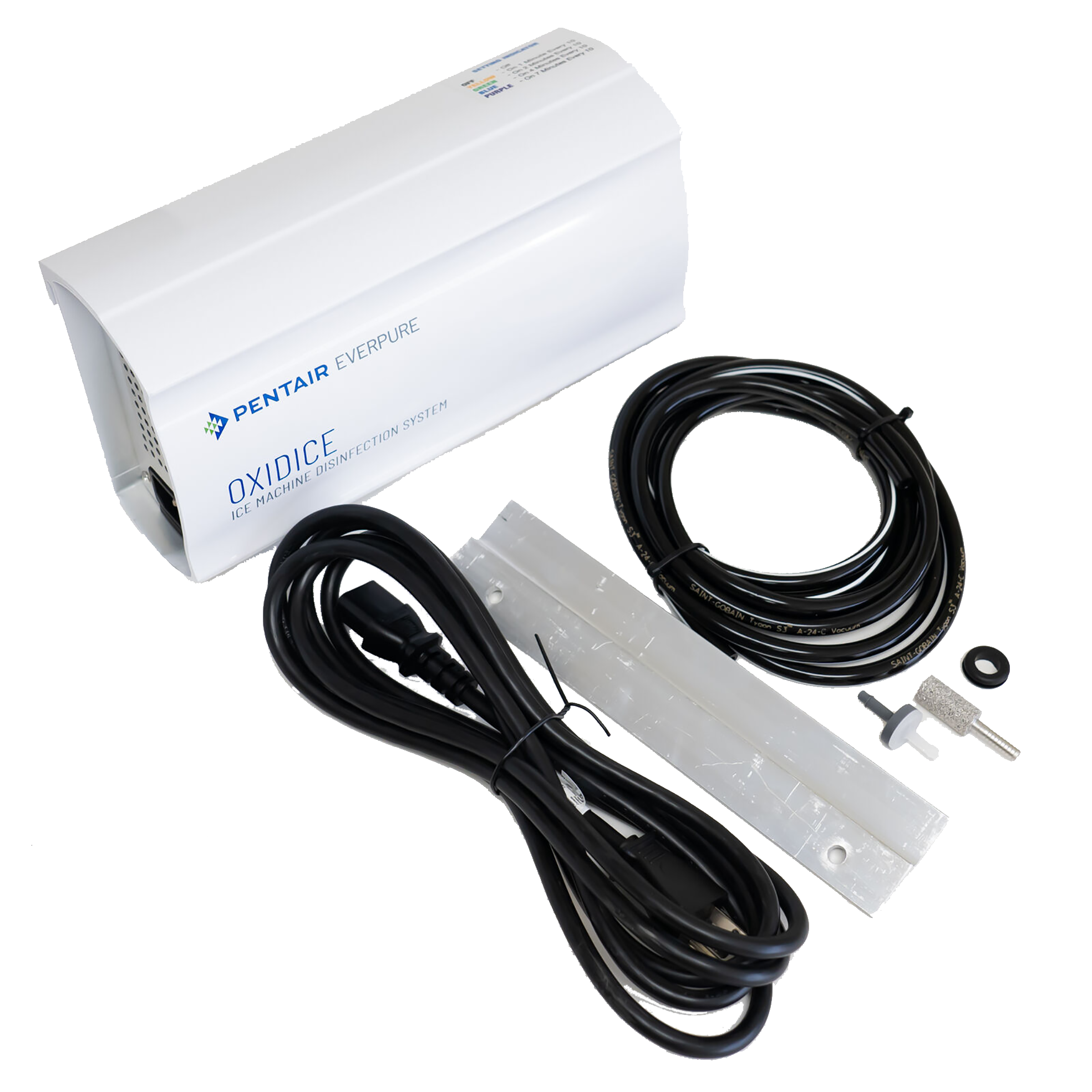 Everpure Oxidice is an environmentally friendly device allowing you to infuse dissolved ozone into an ice maker water reservoir. It takes oxygen from the air and converts it into ozone (O3), a very powerful natural oxidizer, and then bubbles that ozone into the water sump inside the ice machine. The system delivers ozone through a single hole in the ice machine to a diffuser in the sump allowing ozone to dissolve in the water, treating the water, as well as off-gassing into the chiller compartment and treating all of the internal. Any unused ozone quickly breaks down to oxygen, leaving no harsh chemical residue and discharging no harsh chemicals into the water.