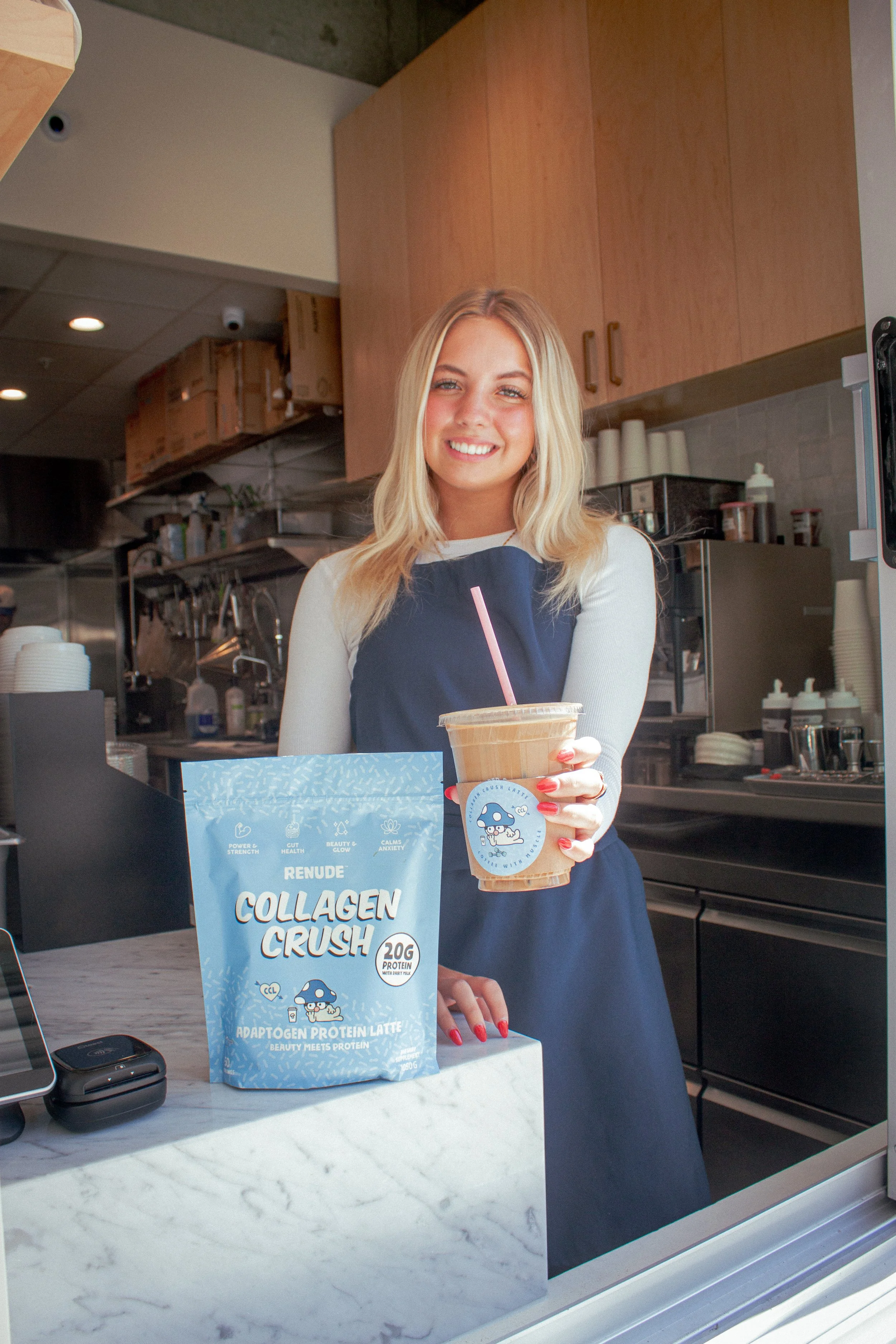Independent café operators are some of the hardest working people in hospitality — yet they're expected to constantly innovate their menus while running a seamless operation. Renude was built for them. Our functional blends are formulated specifically for coffee shop menus and drop straight into existing workflows without holding up the line. Collagen Crush is our latest offering and it's giving independent cafés a powerful new way to compete with the nation's biggest coffee chains. The first and only protein boost formulated specifically for specialty cafés, Collagen Crush was engineered from the ground up to work with coffee. Where generic protein powders clump, clash, and compromise flavor, Collagen Crush dissolves seamlessly into any espresso-based drink, delivering a smooth, subtly sweet vanilla profile that enhances every sip rather than masking it. Each serving packs 20g of protein (when made with dairy milk), powered by premium grass-fed bovine collagen peptides and a functional adaptogen blend: KSM-66 Ashwagandha for stress relief and calm focus, and Lion's Mane extract for mental clarity. Organic coconut sugar, real vanilla bean powder, and organic cacao deliver natural, clean sweetness with no artificial anything. Hot or iced, Collagen Crush transforms a standard latte into a beauty and wellness powerhouse. It supports glowing skin, strong hair, and healthy nails without adding a single second of complexity to your baristas' workflow. Simple for the barista. Transformative for the guest.